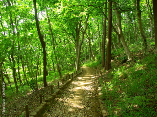 Obraz premium 木漏れ日の新緑の林風景