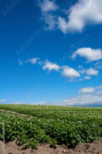 Obraz premium 白い花が咲くジャガイモ畑と青空