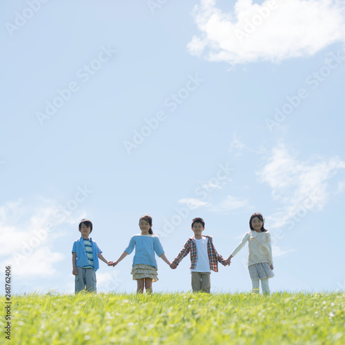 Fototapeta premium 草原で手をつなぐ小学生