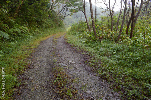 © Ta-c, Fototapeta premium 森へと続く轍のある一本道