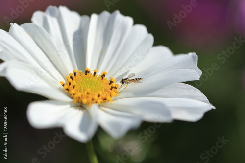 Obraz premium 白い秋桜とヒメヒラタアブのクローズアップ