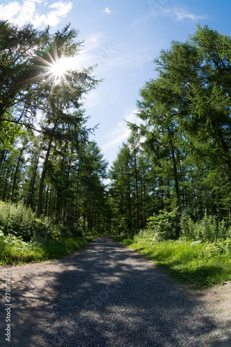 © kinpouge, Obraz premium 新緑のカラマツ林と砂利道
