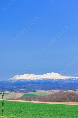 Fototapeta premium 北海道美瑛 青空と草原と残雪