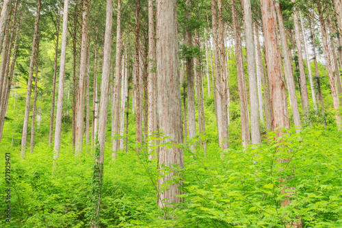 © omune, Obraz premium アジア,日本, 長野県,大桑村,木曽,長野, 植物,樹木,木,新緑,檜,林,森,緑,森林,新緑,草,葉,木の葉,幹, 木材,材木,原木, 屋外,自然,風景,自然風景,日本の風景,景色, 晴れ,昼, 5月,初夏,夏, 林業,
