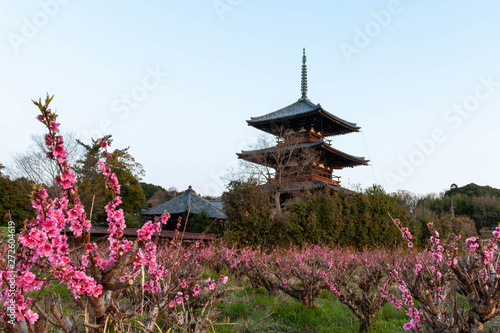 © sigmaphoto, Obraz premium 夜明けの寺の塔と花桃