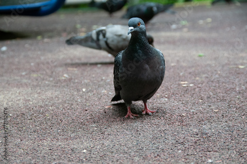 © Vladimir, Obraz premium Голубь городской на фоне асфальта и с другими голубями на заднем фоне с близкого расстояния, вид спереди
