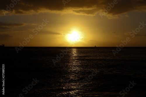 Obraz premium ハワイ:オアフ島・サンセット ワイキキビーチの綺麗な夕日とヨット