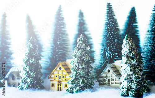 Naklejka premium 冬の森の中の家と木と雪