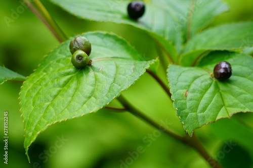 © askaflight, Fototapeta premium 葉の上に果実が実るユニークなハナイカダ