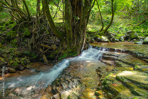 Obraz premium 兵庫県・小代渓谷の自然風景、岩盤上に渓流