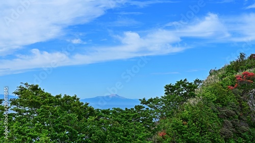 Obraz premium 室蘭地球岬からみた駒ケ岳とツツジのコラボ情景