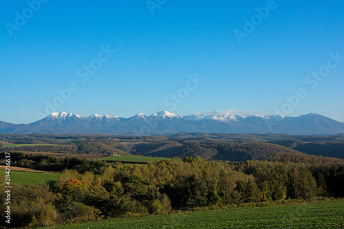 Obraz premium 秋の大地と冠雪の山並み 十勝岳連峰