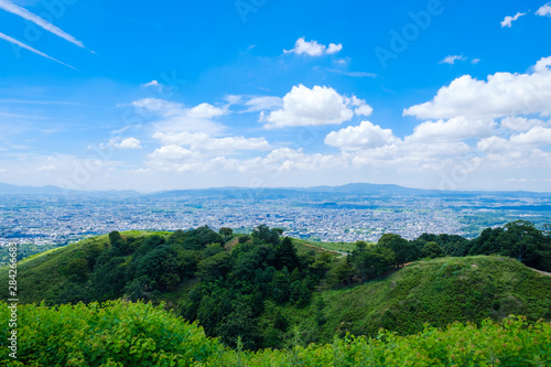Obraz premium 【写真素材】夏の若草山から見た奈良の街 青空 空 雲 夏の空 背景 背景素材 8月 コピースペース
