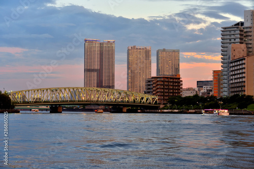 Obraz premium 隅田川から眺める夕暮れの豊洲ビル群