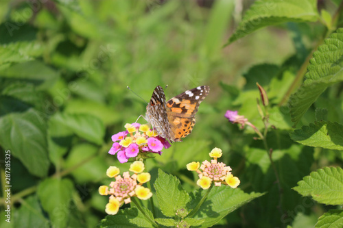 Obraz premium ランタナの花の蜜を吸うヒメアカタテハ