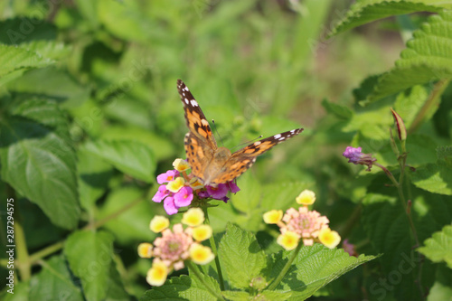 Obraz premium ランタナの花の蜜を吸うヒメアカタテハ