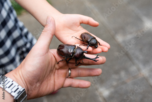 Fototapeta premium カブトムシを持つ親子の手