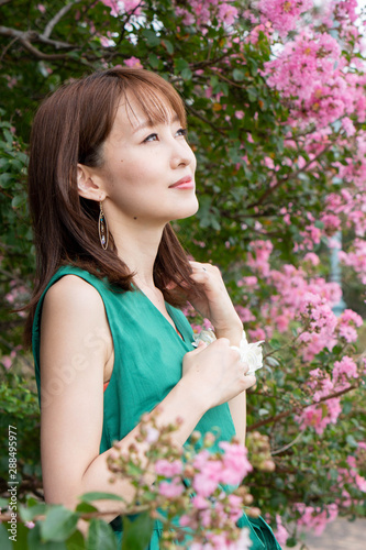 © E-Saishu, Fototapeta premium ピンクの花と若い女性
