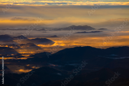 © HK-JP, Fototapeta premium 朝焼けに燃え上がるような真赤に染まる雲海の風景