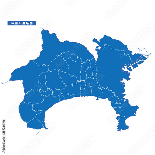 Obraz premium カナガワ県地図 シンプル青 市区町村