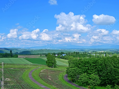 Fototapeta premium 十勝連峰をバックに広がる広大な大地の情景@富良野、北海道