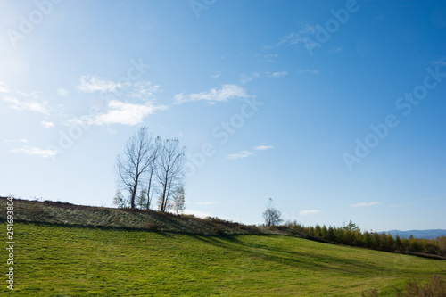 Fototapeta premium 秋の青空と葉が落ちたシラカバの木 美瑛町