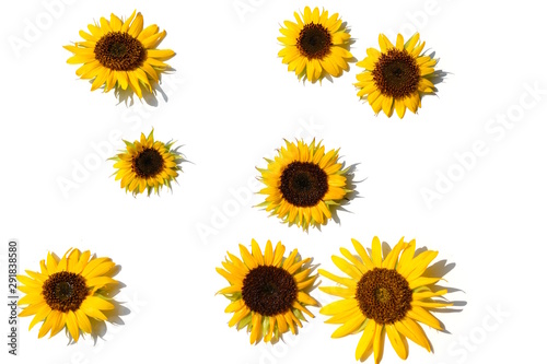 Fototapeta premium ヒマワリ、黄色い花、夏、明るい、元気。白背景。花イメージ素材。