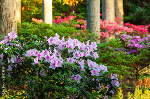Fototapeta premium カラフルなツツジの花と朝日の光