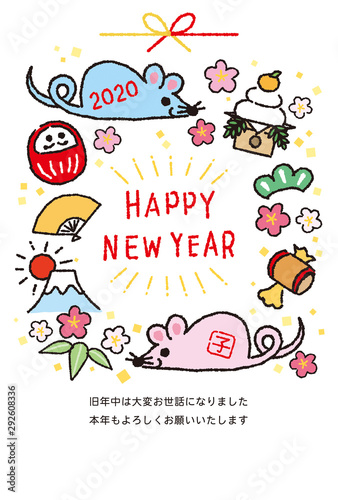 Obraz premium 年賀状テンプレート 2020年子年 手描きネズミと縁起物 カラフル