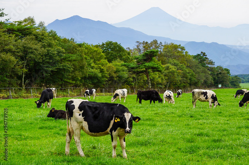 © ZUN, Fototapeta premium 2021年の年賀状に!富士山を背景に、山梨県八ヶ岳牧場で寛ぐ牛