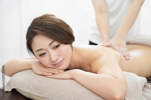 © mapo, Fototapeta premium 明るいエステサロンで背中のマッサージを受ける女性(目を開けている)
