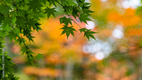 © zum, Obraz premium 軽井沢の紅葉の中の緑の葉 雲場池 スワンレイク