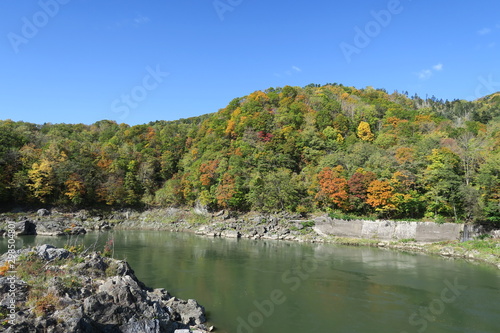 Fototapeta premium 日本国北海道の秋の紅葉の山と川