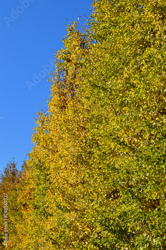© Aki Shima, Fototapeta premium 青空を背景にして、黄葉したイチョウの樹の並木の梢をローアングルで撮影した写真