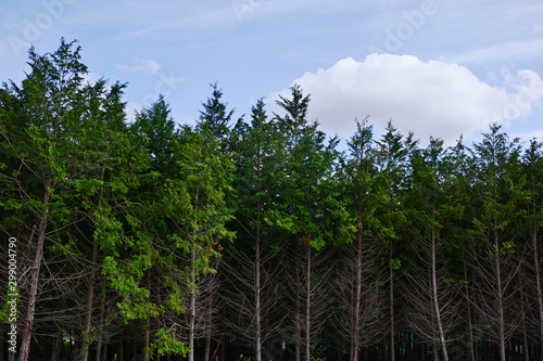 Obraz premium 杉林と白い雲のある秋の青空