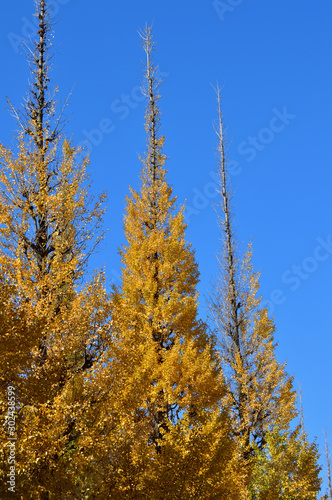 Fototapeta premium 青空を背景にして、黄葉したイチョウの樹の並木の梢を撮影した写真