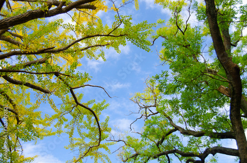 © Purple viola puncti, Obraz premium 銀杏の紅葉と青空