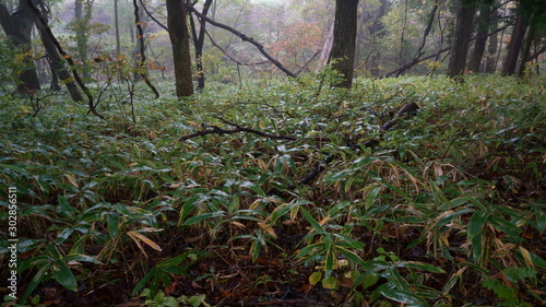 Fototapeta premium 濃い朝霧に包まれた秋の林