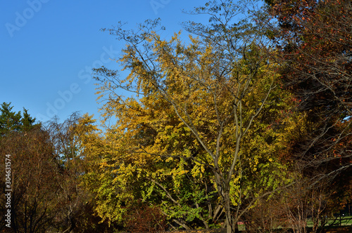 © Aki Shima, Obraz premium 青空を背景にして、黄葉した樹木を撮影した写真