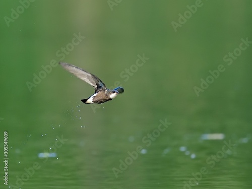 Obraz premium 新緑映す水面を高速で飛ぶハリオアマツバメ