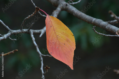 Obraz premium 黄色からオレンジ色のグラデーションに色づいた桜の葉
