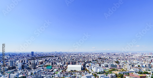 Obraz premium 都市風景 東京 関東 日本 パノラマ ハイアングル 鳥瞰図 快晴 青空 都市 ビジネス 不動産 首都