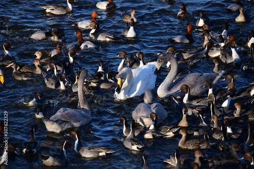 Fototapeta premium 混雑、オオハクチョウ、カモ、千葉県、2019年冬