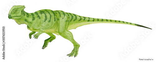 Naklejka premium 白亜紀後期のモンゴルに生息。頭骨に特徴のある堅頭亜目はこのホマロケファレ科と棘が多いパキケファロ科に分かれるが、ホマロケファレはパキケファロ科の恐竜に比し...