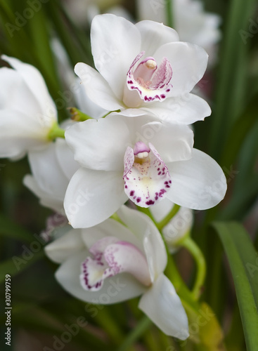 Fototapeta premium Ветка белых орхидей на фоне зелени