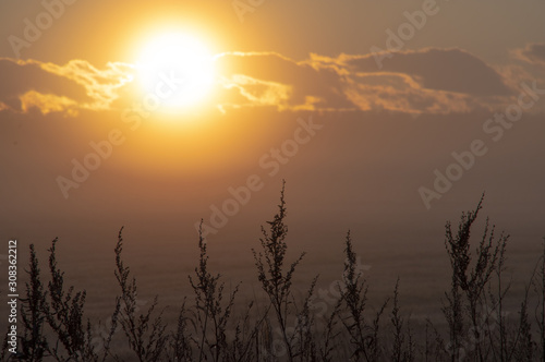 Fototapeta premium 豊かな大地を照らす朝陽。草原の朝の風景。