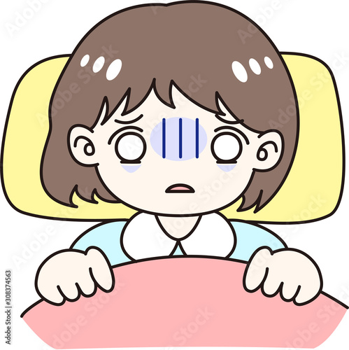 © Daphnia, Obraz premium 女の子 人物 不眠症 不安 ショック 風邪 体調不良 布団 悩み 夜 寝る