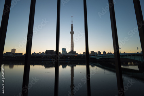 Naklejka premium 柵越しに見た東京スカイツリーと朝焼け