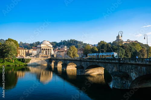 Naklejka premium トリノ ポー川とグラン・マードレ・ディ・ディオ教会 夕方