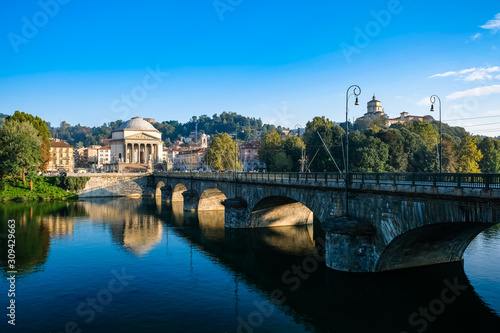 Naklejka premium トリノ ポー川とグラン・マードレ・ディ・ディオ教会 夕方